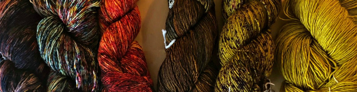 The colors are, from left to right: Renaissance, Carnival, Paprika, Glitter, Aureo, and Frank Ochre. There's a space in the middle waiting for a transitional color. I ordered a skein of Volcan, shown below right, and I'm going to order a skein of Art Nouveau, below left.