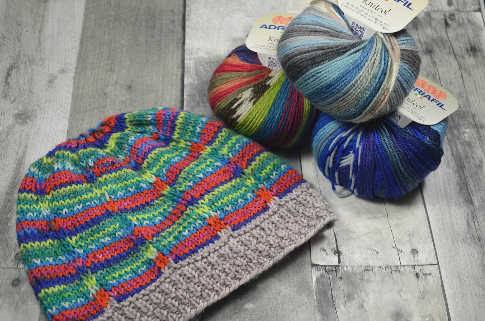 Another great option is the Sky Bound Hat that beautifully showcases the colors of Adriafil Knitcol. The dyeing has been worked out on an eight-colour thread just right to achieve a real jacquard effect. By simply working with knit and purl stitch, you will get a colored, striped pattern with jacquard elements.