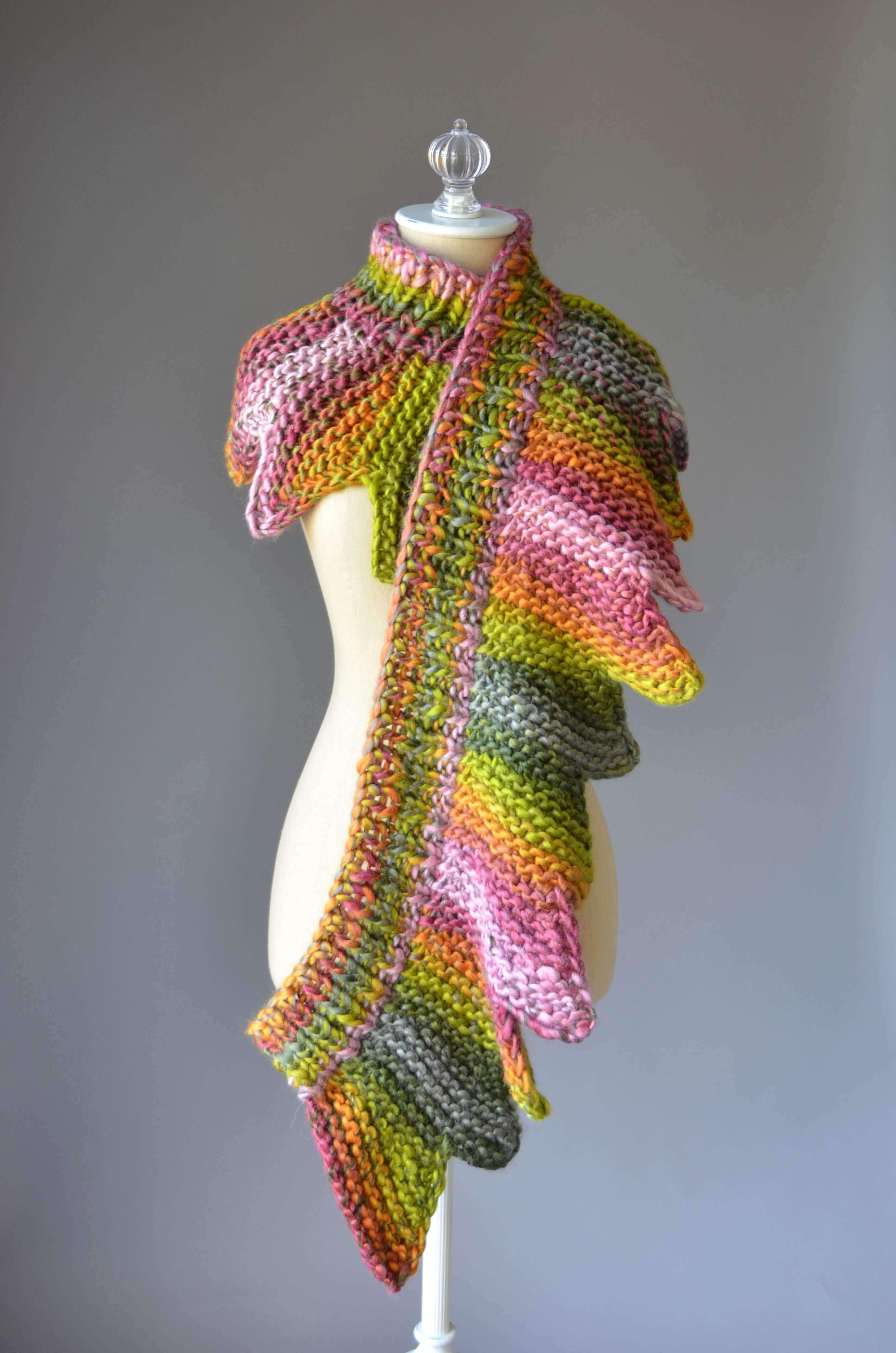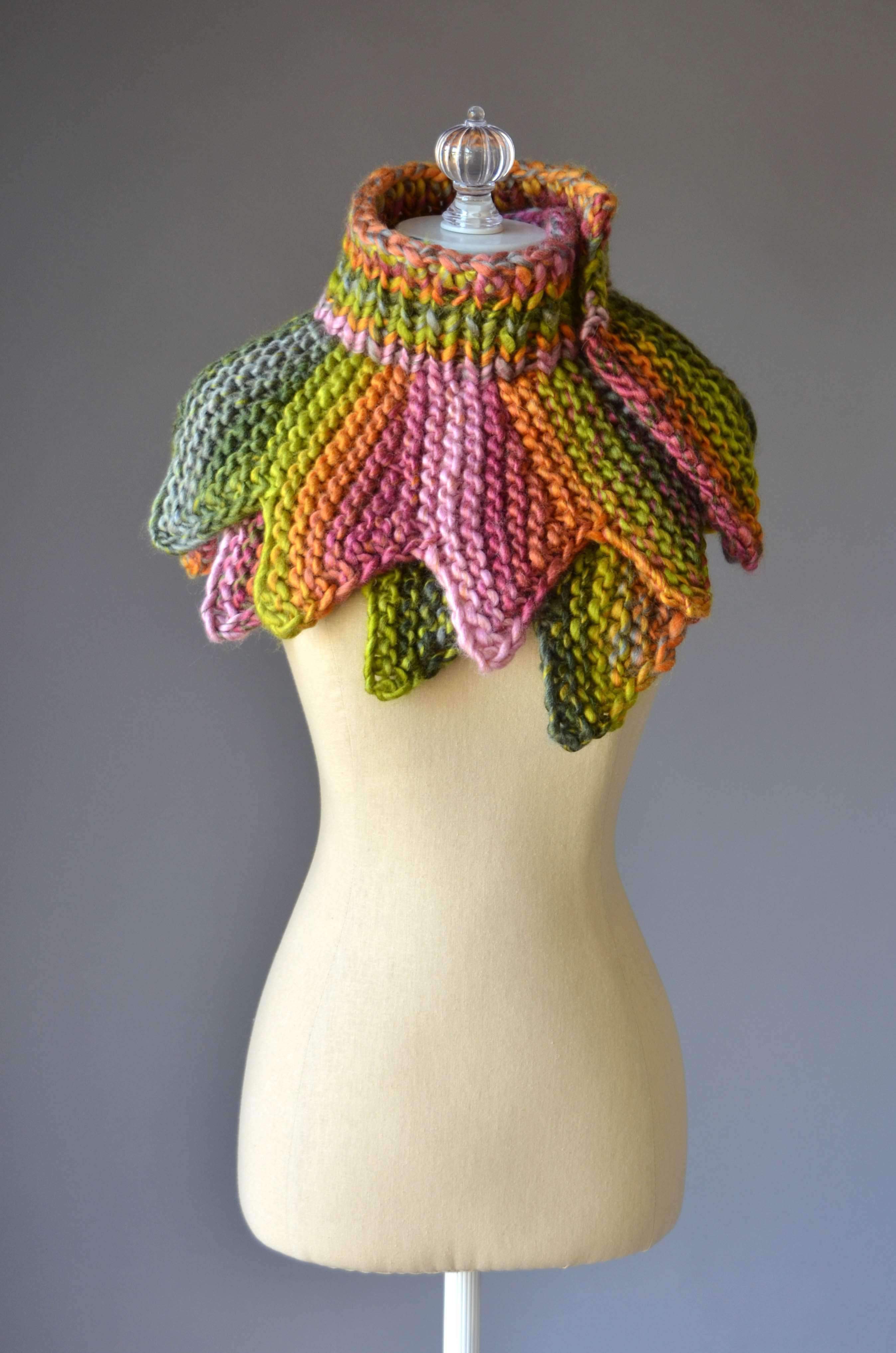 Super ChunkyThis quirky scarf knits up fast in a super bulky yarn. Each of the 18 “petals” is shaped through short-rows and decreases. After the lower petal section is complete, ribbing is worked upward from the straight/unshaped edge.