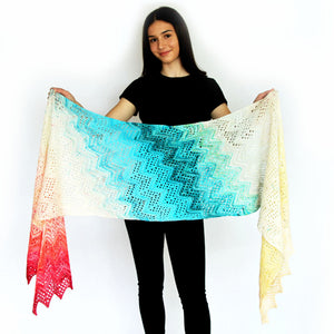 Super FineThe ADVENTurer Scarf & Wrap was designed with a Yarn Advent Calendar in mind to make the most of daily mini skein gifts that appear. There are so many possibilities - add colors randomly, arrange your minis in a gradient fade, or use a main color and alternate with mini skeins. This is also a perfect way to use up all those leftover yarns hiding in your stash. Simple garter stitch and chevron eyelet lace keeps this a mindless knit; easy shaping and the regular color changes will keep you wanting to knit on.