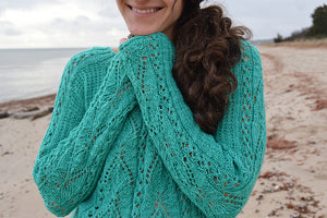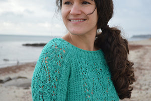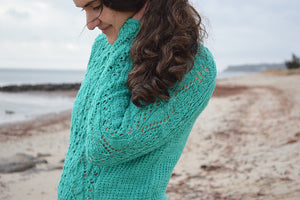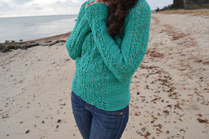 The Boheme Pullover is a modern sweater featuring a unique lace panel that runs up the center front and sleeves giving the bottom of both the body and the sleeves a one of a kind curved edge. Textured stitches on the sides and back add interest and make for an engaging project. This design has a classic fit with a full length body and fitted sleeves but at the same time the design elements give it a whimsical, romantic feel. The design is knit in pieces and the saddle sleeves are sewn to the drop shoulder for a dramatic touch. This design is just as much fun to knit as it is to wear!
