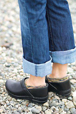 Inspired by a pair of socks entered in our ‘Koigu & You’ customer show, we designed these little one-skein slipper-socks for the 2009 LYS Tour. They make great gifts as they’re easy to fit and don’t take a lot of yarn. They’re nice for around the house. And terrific for travel. Our staff loves to wear them with clogs.
