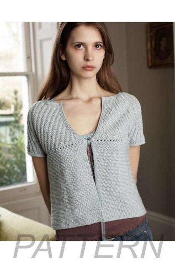 Tie front short sleeved cardigan with delicate lace details. Requires 8-11 balls Debbie Bliss Rialto DK Pair each size 3.75 and 4mm (US 5 and 6) knitting needles Multiple sizes included