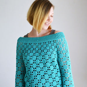 This casual and feminine everyday top worked in DK cotton yarn is great for summer and layering all year round. A delicate lace pattern which primarily uses the simplest crochet stitches: single crochet, double crochet and chain makes it a quick and simple crochet pattern.
