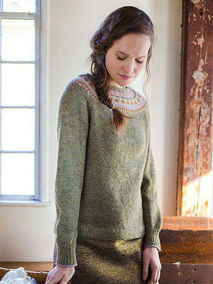 Helen is worked from the top down in the round. This pullover has a hybrid raglan-yoke with Bohus-inspired stranded color-work. Pattern is charted.