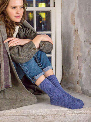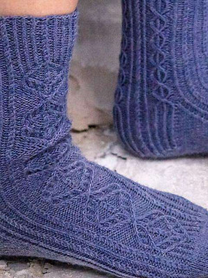 Hestia is an intricate, cabled sock pattern worked from the cuff to the toe. Pattern is charted.