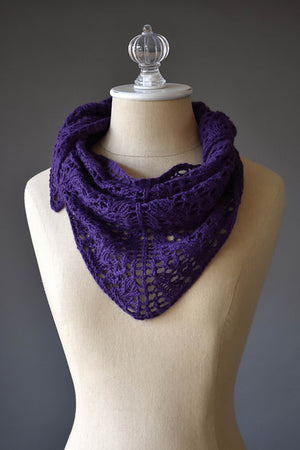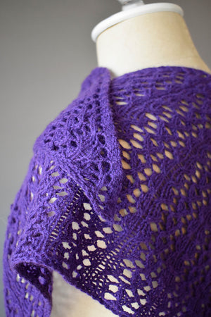 The stitch pattern is easily memorized and would make this a great project for the beginner lace knitter. The Hyacinth Shawlette is worked flat from the top down. The wings of the shawl mirror one another.