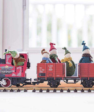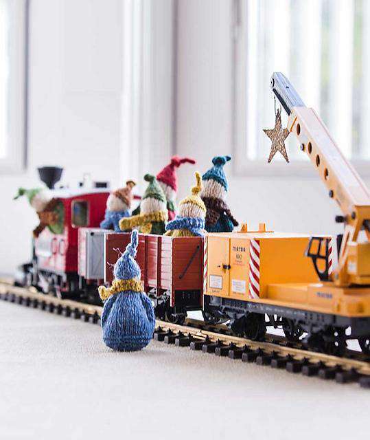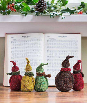 LightThese little handmade pals, created by Jennifer Evans, are perfect on the holiday mantelpiece, tree, or packages. But they’ll celebrate any season cheerfully! Originally designed for fingering-weight yarn (like Rowan Fine Tweed, we love them just as much a bit bigger in DK-weight yarn (like Rowan Tweed). Once we started knitting them, we just couldn’t stop!
