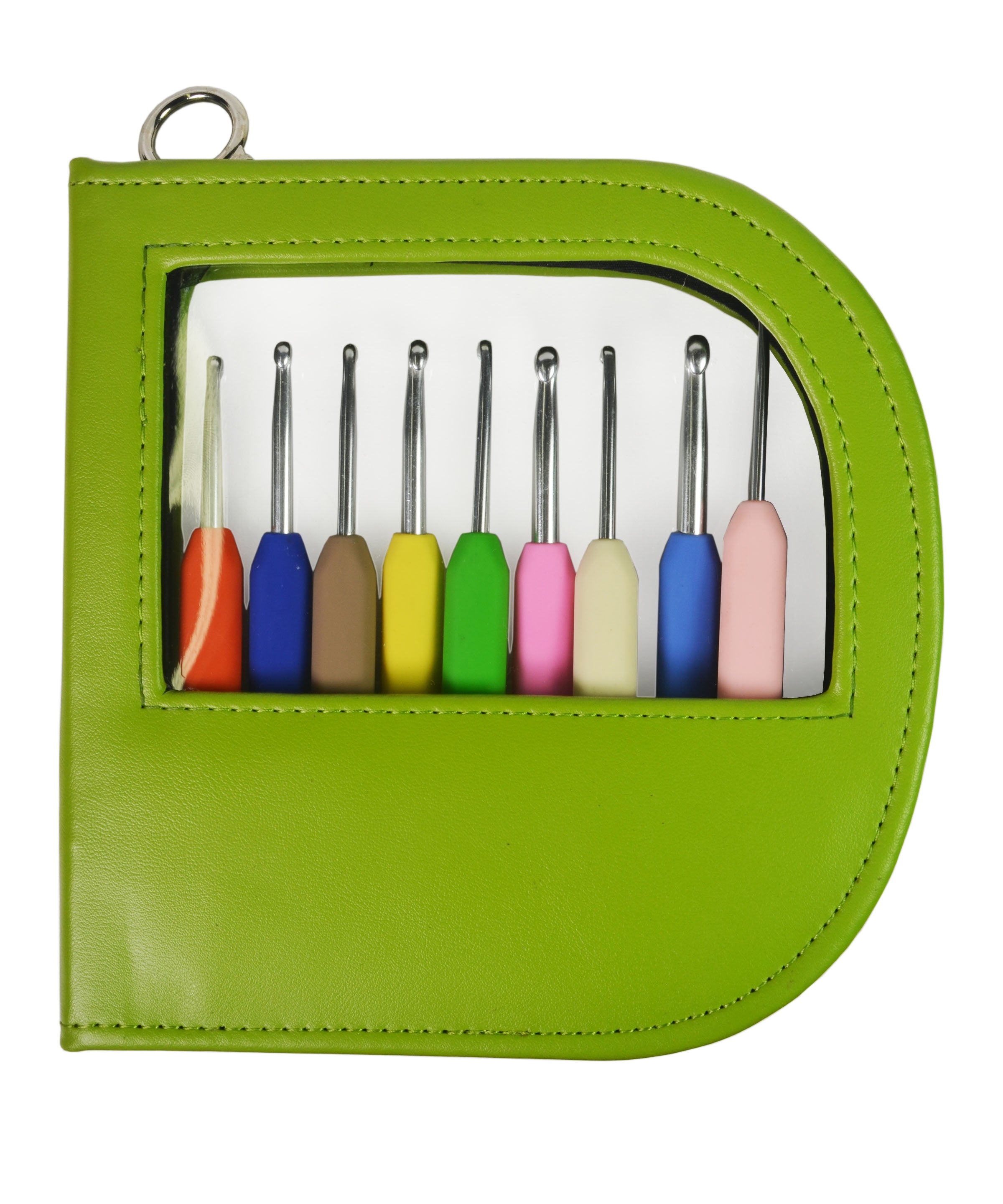 Aluminum crochet hooks feature soft plastic grips Comfortable for your hand! Color coded grips 9 hooks, US C(2.75mm)- US J(6.0mm) Convenient case for storage and travel.