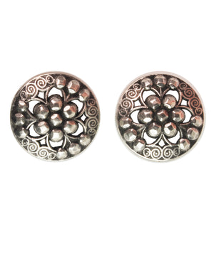 La Mode Vintage buttons are inspired by styles, materials and designs from bygone eras. Add an old world or vintage look to your craft and sewing projects. This button design has a center Flower surrounded by swirls and circles in antique silver. The design is circa 1890.