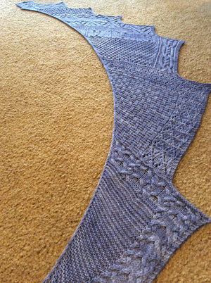 Super FineA highly textured shawl worked lengthwise. This design will keep you interested the whole time with its combination of cables, lace and k/p stitch patterns. Looks great in a gradient or more solid/semi-solid yarn.