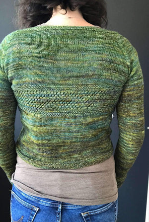 g is constructed in an unusual manner. It is knit from the top down, from the back neck and shoulders to the underarms. The sleeve stitches are then put on hold and the back stitches are worked together with stitches picked up along each front raglan (diagonal edges of sleeve sections) to form the back and fronts of the body in one piece. An easy textured band adds visual interest. For all sizes except XXXL, short rows are worked in the back. Sleeves are worked in the round, and can be worked as short, elbow-length or long sleeves.