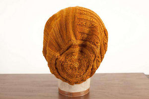The body of the hat is worked sideways, back and forth in rows, then grafted into a cylinder. Stitches for the ribbing are picked up along one edge of the body and worked in the round. Stitches for the crown are picked up along the remaining edge of the body and worked in the round with decreases for the top of the head.
