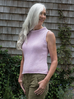 This simple tank is knit in pieces with rolled edges and visible shaping details. A great piece for your spring wardrobe!