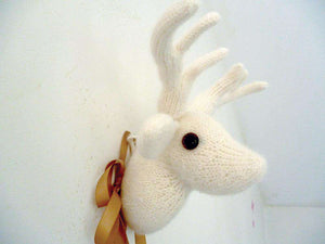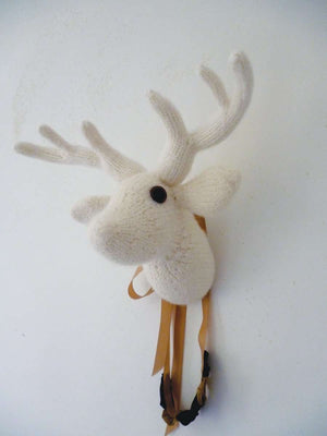 WorstedThis pattern is knitted in the round over 4 needles with no seaming. The ears and antlers are knitted separately (in the round) then whip stitched onto the head afterwards. The whole head is then felted in a washing machine to give it stability when positioned on a wall (a simple ‘d’ ring sewn onto the back of the neck then hooked over a nail or hook on the wall is all you need). The eyes are toy safety eyes though circles of felt or a pair of buttons will also suffice.