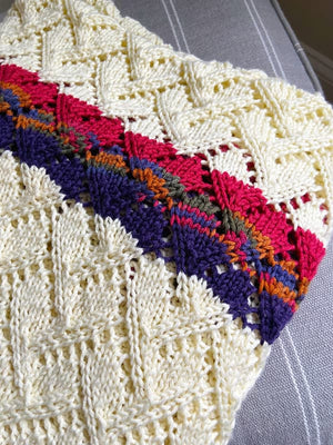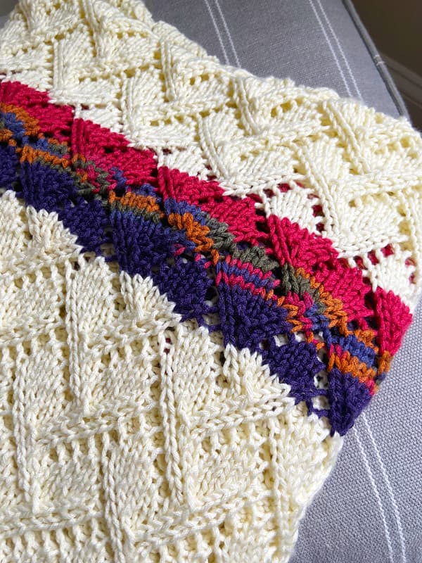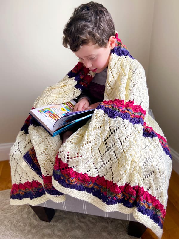 We designed a perfect sized blanket made for being dragged around the house to find the perfect reading nook. The lace repeat is simple to follow with added stripes in Comfort Print.