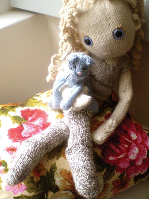WorstedA new doll - Pixie Moon - and so far my favourite! She is a little bigger than the babies and knitted closely in aran yarn on 33/4 needles although if this is too tight for you - a dk weight will do it! I’ve knitted her in the round so there is absolutely so sewing up - her legs are included in the make up of the body - you just have to sew on her arms. And the hair - oh this is so much fun to do - and to play with afterwards - it’s constructed as single lengths of crochet and is a cinch - but so effective. I’ll be adding many more clothes - the clothes for the baby doll could also be used with tiny adjustments in the gauge. Have a go, she’s so lovely and quick to knit!