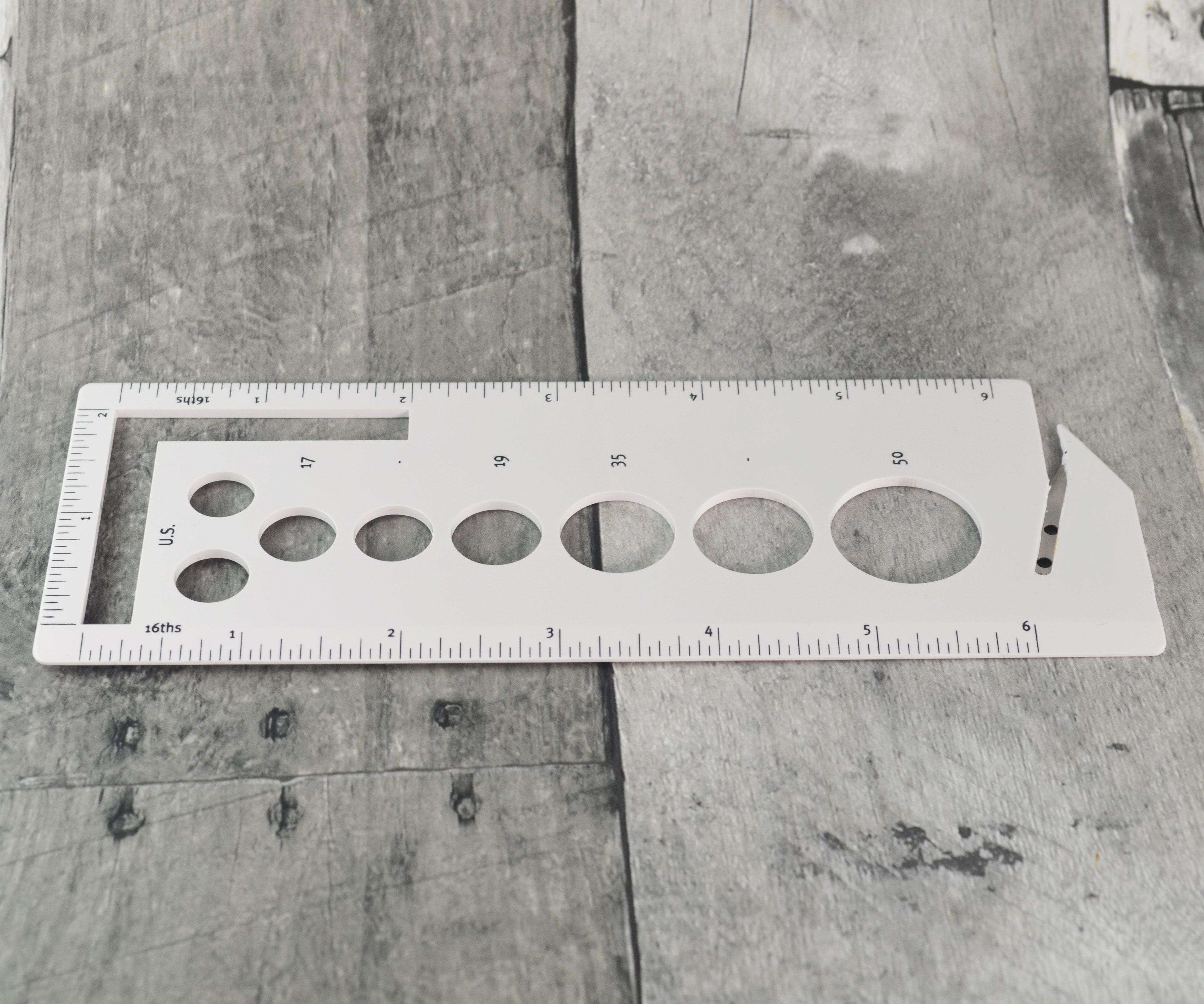 Plastic needle gauge. 15cm ruler with needle and knit gauge. Includes handy yarn cutter. Caution: Sharp blade. Two Sizes available