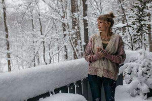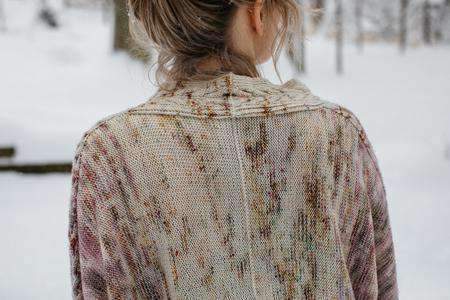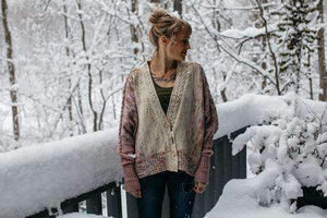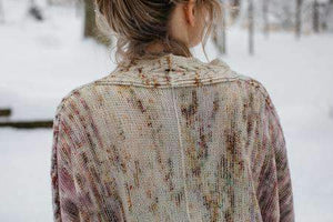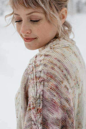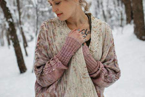 This open cardigan is a true adventure in knitting! Combining unique sideways construction, cables, fading and exposed seams to create a flattering oversized dolman style sweater that looks great on all types of figures! Knit in one color or four, to suit your style! This sweater has a beautiful curved underarm that creates a lot of drape for an oversized look, with long, slim cuffs that give you different styling options. You can either wear them long, to accentuate the slender portion of your arm, or cuff them for a shorter sleeve!