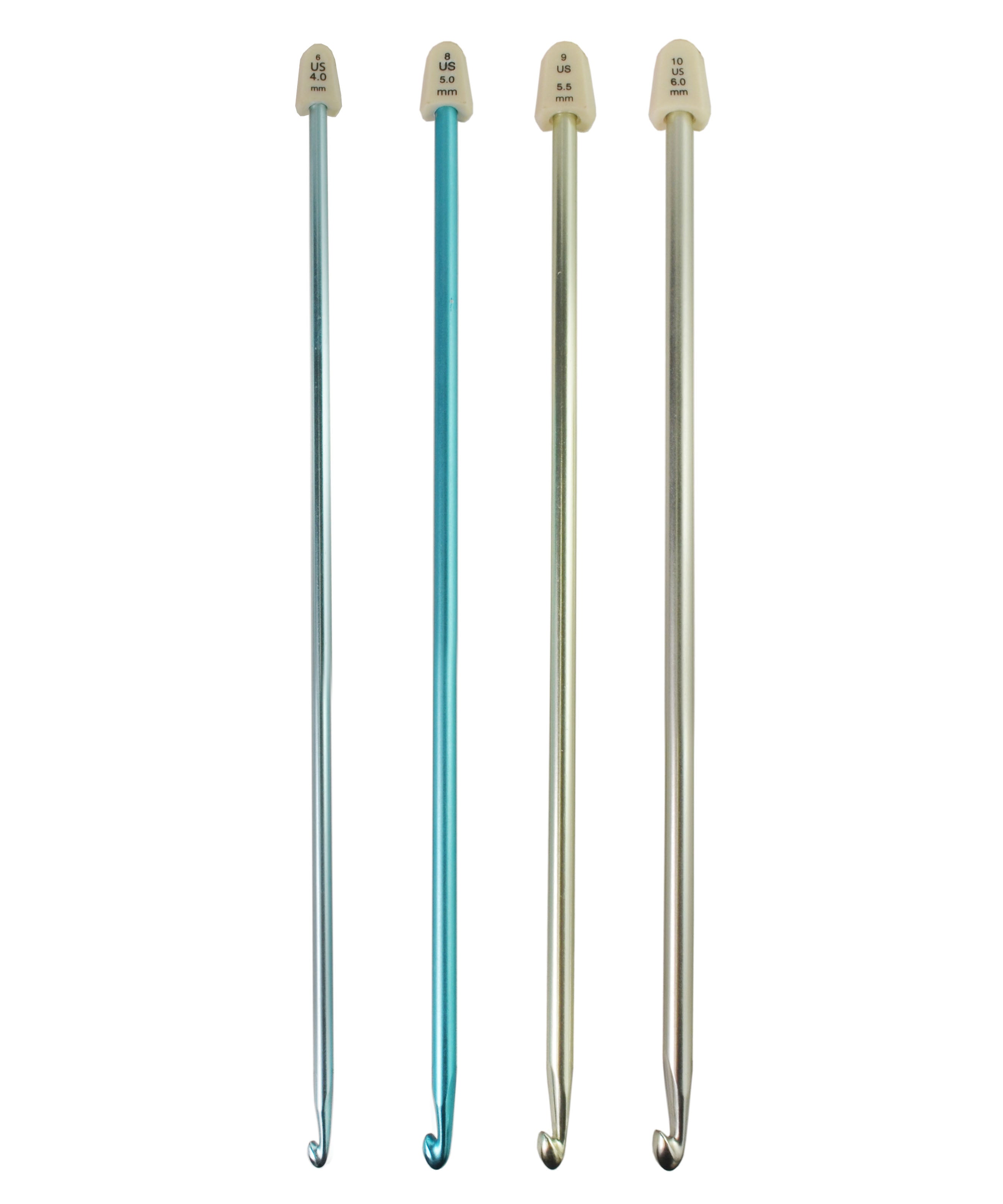 Susan Bates 10 inch crochet hooks. They are made from light weight aluminum. Each hook is color coded by size. These are strong and durable hooks and can be used for your crochet projects.