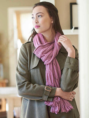 A clever cable adorns this long scarf knitting pattern, worked from either a chart of using the written instructions. Fringe is added in finishing.
