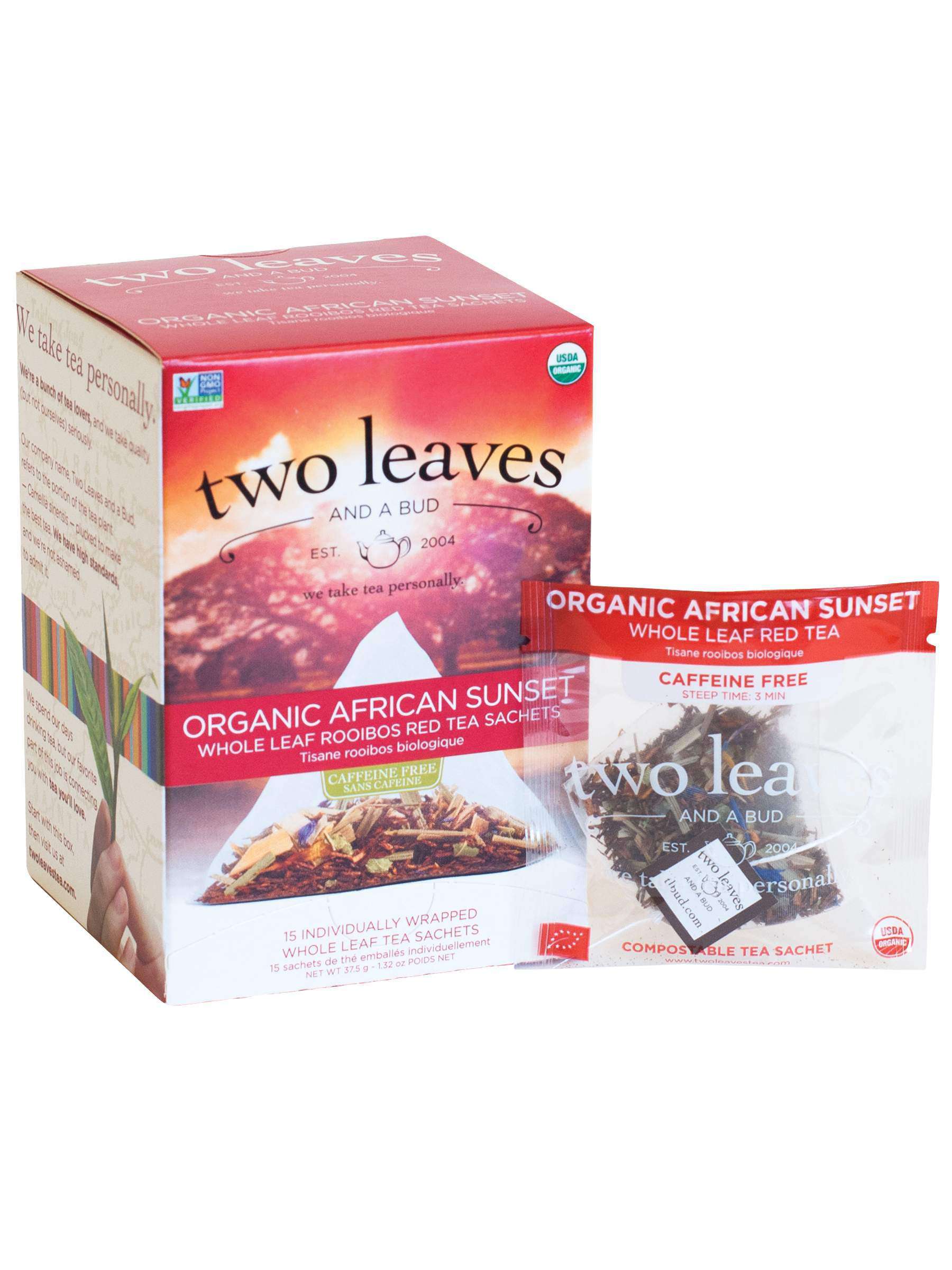 We call this organic tea “African Sunset” because rooibos is grown in South Africa, where it's cherished for its woody-sweet, earthy flavor. We add a touch of lemongrass to brighten up this tea on your palate. Naturally caffeine free, the Rooibos plant is a member of the legume family. It has little needle-like branches and pretty yellow flowers. This Organic tea comes in whole leaf tea sachets, give this Rooibos tea (red tea) a try today!