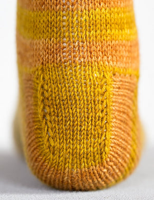 The Heel is turned using three DPNs knit flat in short rows to maintain the striping more consistently. The number of leg sts is greater than those for the foot, and either can be easily increased or decreased at the Heel flap section for better fit, as desired.