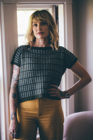 I have been wearing this sweet sweater while discovering all of the amazing used bookshops in Portland, ME. This cropped tee is perfect for layering through all the seasons! I used a cotton/wool blend for a summer version and switched to a 100% wool yarn for a warmer crop. The stitch pattern is just engaging enough so that you don’t want to set it down!
