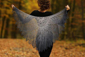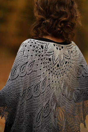• Construction: The shawl is worked from the neck down and bound off using either a knitted picot bind off or a crochet picot bind off, according to taste.