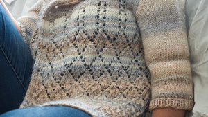 Worked in one piece from the bottom up with a geometric lace pattern and wrapped stitches, this easy cardigan has minimal shaping but maximum impact. Wear it with the fronts open for a casual look, or dress it up with a fancy shawl pin to close them.